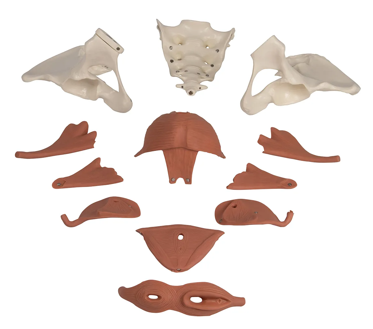 The model consists of a total of 12 parts, including the two halves of the pelvis and the sacrum. The model is held together by magnets, allowing individual parts to be easily removed for demonstration of the different layers.